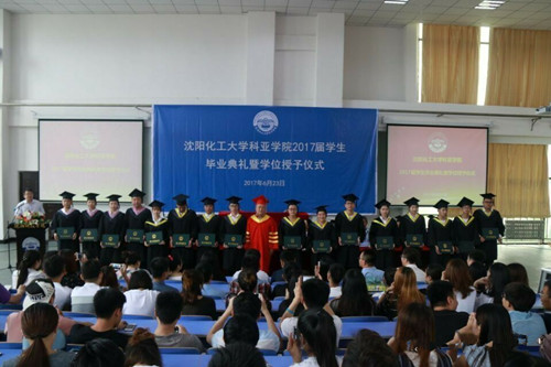 毕业典礼在雄壮的国歌声中拉开帷幕。首先由党总支书记王一女、副校长王喜魁分别宣读2017届学生毕业名单、获得学士学位学生名单、优秀毕业设计论文学生名单、辽宁省优秀毕业生名单、校优秀毕业生名单、2017届考取研究生获校励志奖学金学生名单;之后,学校领导为2017届毕业生代表和获奖学生颁发毕业证书和获奖证书。校长杨化仁为学士学位获得者颁发学位证书并授予学位。