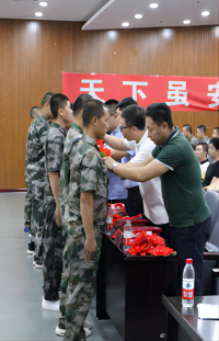 会上,征兵工作站负责同志简要介绍了学校2019年征兵工作开展情况,宣读了学校2019年应征入伍新兵名单,并向入伍新兵发放纪念品、佩戴光荣花。随后,机械与交通工程系孙书雷代表入伍新兵发言,感谢父母支持,感谢学校领导和老师们的关心和帮助,并表示以后一定会刻苦训练,努力学习、不怕吃苦、不怕受累,服从组织、尊重领导、团结同志,努力学习军事技术,使自己尽快从一名普通青年向一名优秀的合格的军人转变,为祖国的和平与安宁扛好枪、站好岗;管理系张也代表退役士兵发言,告诫战友们服从命令、听从指挥,勇敢顽强、严守纪律,珍惜荣誉、牢记使命,积极献身于祖国的国防事业。