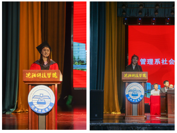 会上,辽宁省优秀毕业生、2021届毕业生代表、管理系社会体育指导与管理专业1701班王羿鸥代表全体毕业生发言。她回顾了求学期间的收获,分享了自己的成长点滴,向母校致以最崇高的敬意,向辛勤培育他们的领导、老师和辅导员们表示最衷心的感谢。并表示生逢盛世、当不负盛世,站在两个100年的历史交会点上,要乗承母校“博学笃行,种德修身”的校训精神,在未来的日子里,砥砺前行,努力奋斗,书写新的辉煌。经济系国际经济与贸易专业1701班毕业生单薇同学的父亲单春龙代表毕业生家长发言。他向广大2021届毕业生表示热烈祝贺,向所有领导、老师们致以最崇高的敬意和最衷心的感谢。并引用余光中先生的“孩子,希望你们自始至终都是一个理想主义者”、荀子的“学不可以已”、王符的“生活需要一颗感恩的心来创造”来寄语全体毕业生,希望学生们以梦为马,莫负韶华。管理系副主任郑鑫老师代表全体教师讲话。她在向毕业生顺利完成学业表示祝贺的同时,建议毕业生坚守信念,勇于担当;坚守初心,拒绝浮躁;坚守岗位,终身学习,在学习中获得前行的力量,不断地完善自我,超越自我。