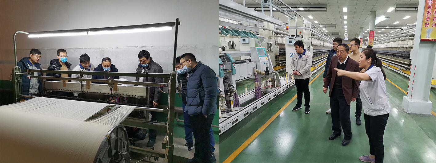 12月30日上午,陈校长一行深入到公司生产一线,参观了纺纱厂、印染厂、研发部等厂区,调研企业生产过程中的技术问题。