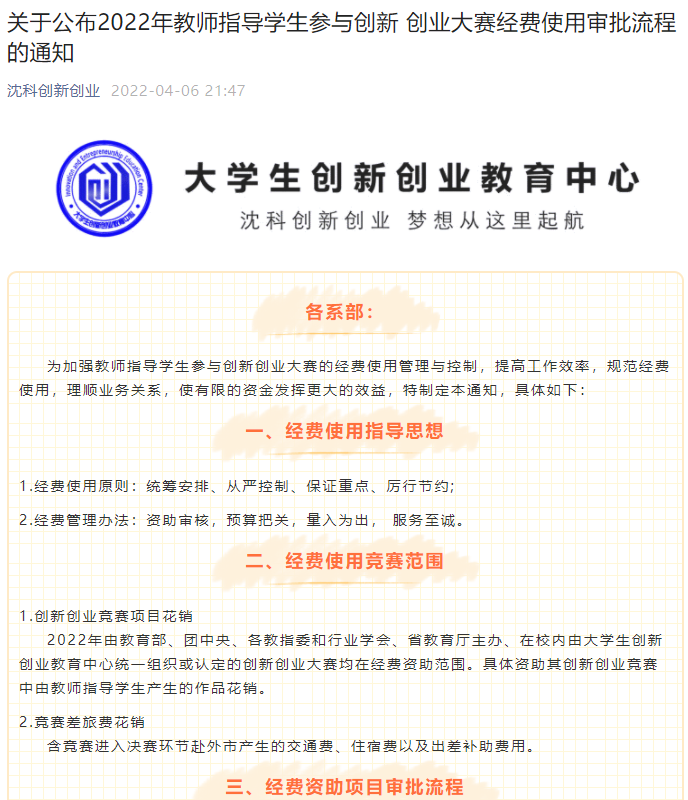 为加强疫情期间教师指导学生参与创新创业大赛的经费使用管理与控制,提高工作效率,规范经费使用,理顺业务关系,使有限的资金发挥更大的效益,大学生创新创业教育中心发布了“关于2022年教师指导学生参与创新创业大赛经费使用审批流程的通知”。通知中首次提到“四项原则”—统筹安排、从严控制、保证重点、厉行节约;“四个办法”—资助审核,预算把关,量入为出,服务至诚,以全力保障在疫情防控期间师生参与创新创业活动的经费使用。