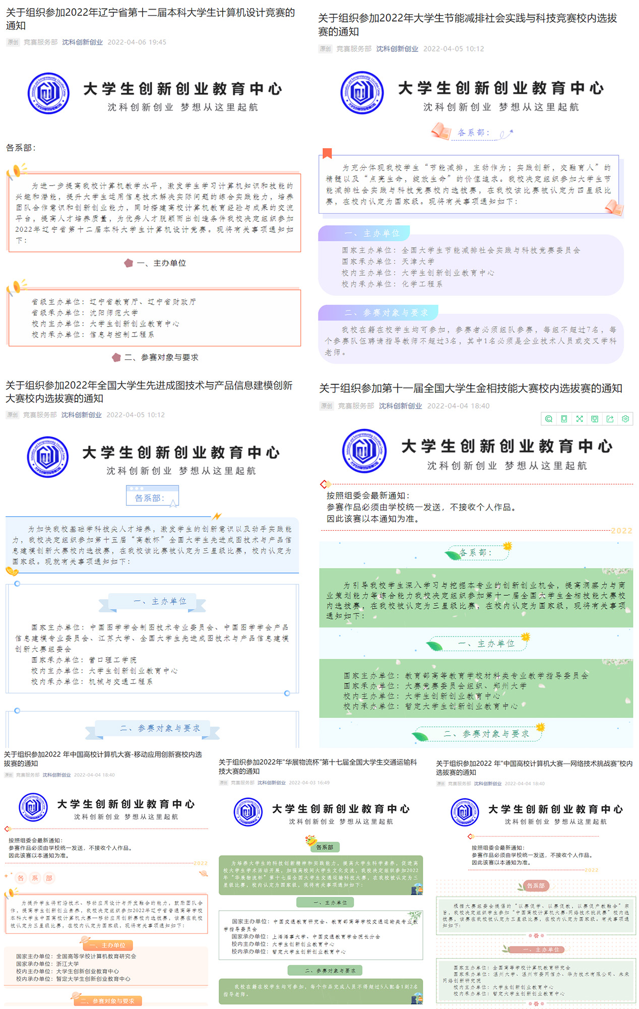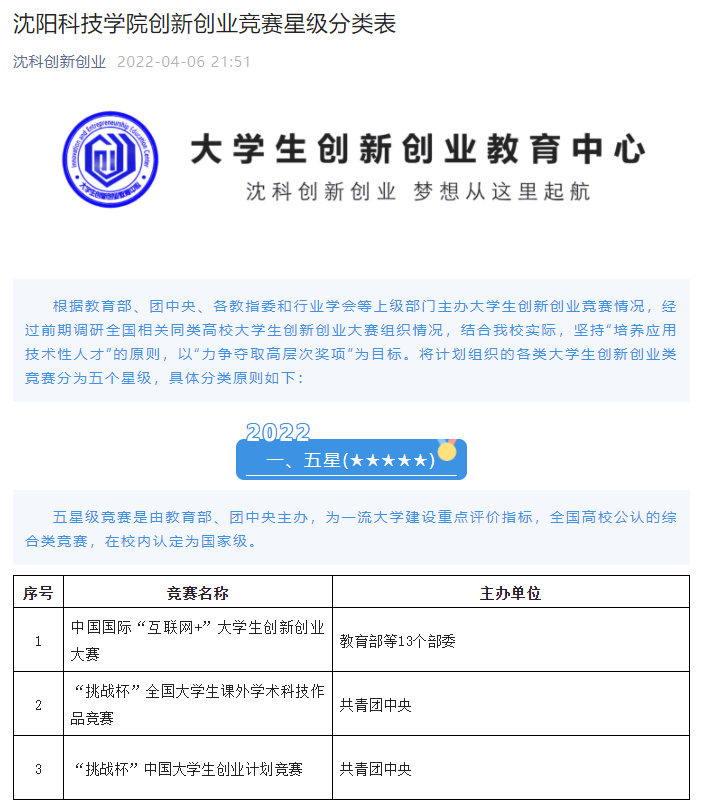 根据教育部、团中央、各教指委和行业学会等上级部门主办大学生创新创业竞赛情况,经过前期调研全国相关同类高校大学生创新创业大赛组织情况,结合我校实际,坚持“培养应用技术型人才”的原则,以“力争夺取高层次奖项”为目标,将计划组织的各类大学生创新创业类竞赛分为五个星级,印发了“九州在线注册创新创业竞赛星级分类表(2022版)”的通知,使全年竞赛开展有计划、有方向、有目标、有成果。