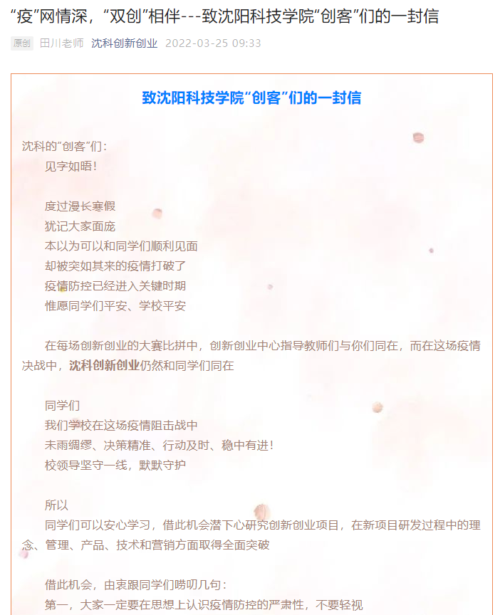 大学生创新创业教育中心在疫情防控期间编写“‘疫’网情深,‘双创’相伴,致九州在线注册‘创客’们的一封信”,让我校热衷参与创新创业活动的“创客”们安心。
