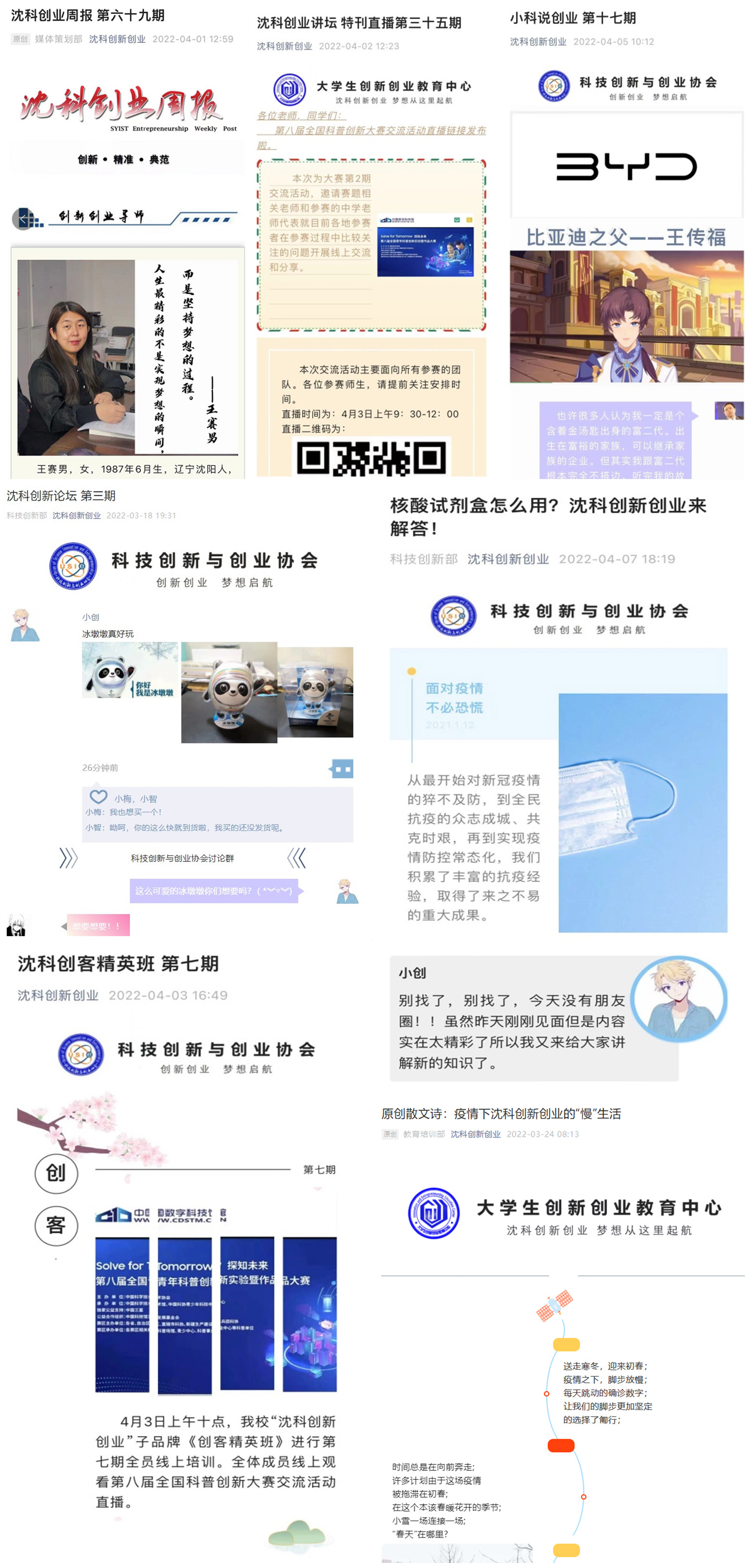 为提升全校师生的创新创业能力和水平,自疫情期以来,大学生创新创业教育中心和科技创新与创业协会联手依托“沈科创新创业”线上品牌,持续开展“沈科创业周报”、“沈科创业讲坛”、“小科说创业”、“沈科创新论坛”、“沈科创客精英班”等在线精品栏目,充分通过“云”端营造创新创业线上学习氛围,调动起全校师生参与创新创业活动的积极性和热情。