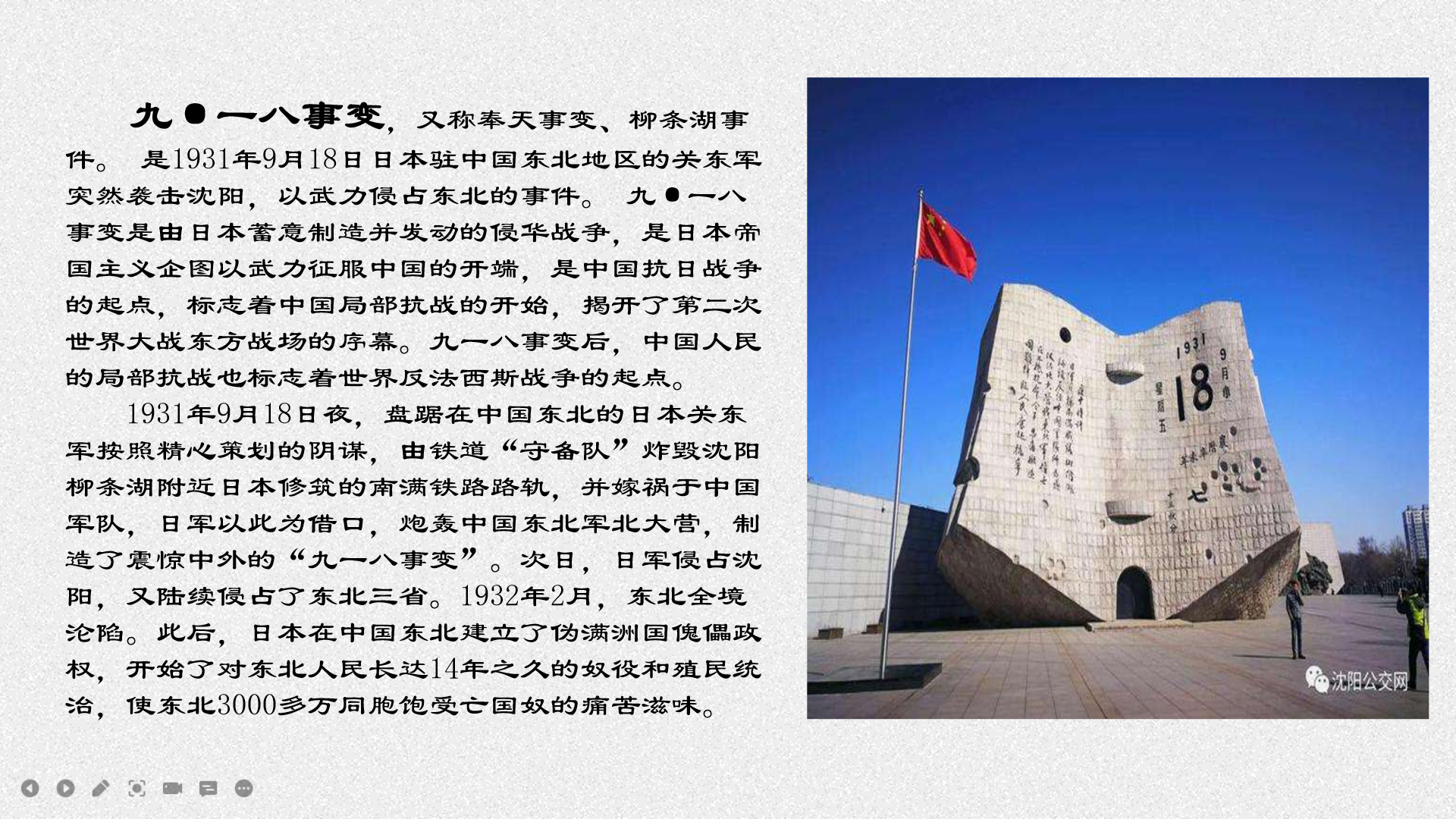 “1931年9月18日,日本侵略者炸毁了南满铁路柳条湖段并栽赃中国军队,以此为借口炮轰北大营……”“面对九一八事变,身处沈阳的中共满洲省委第一时间发表了《中共满洲省委为日本帝国主义武装占领满洲宣言》,是中国共产党领导人民14年抗战史最早的抗战宣言……”这是我校于9月19日开展“勿忘国耻”爱国主义课程思政教育课堂上最直观的呈现,广大教师运用大量史实开展内容讲授,既生动、有效地引导学生牢记历史,又用平实且激昂的言语汇聚起催人奋进的精神伟力,从沈科师生的云端课堂广泛传递到内心深处。