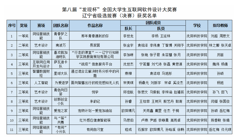 近日,由辽宁省教育厅、辽宁省财政厅、辽宁省工业和信息化部教育与考试中心主办,大连工业大学艺术与信息工程学院、达内时代科技集团有限公司承办的第八届“发现杯”全国大学生互联网软件设计大奖赛辽宁省级选拔赛落下帷幕。在本届赛事中,我校参赛师生全力准备、刻苦钻研,报送的作品在全省21所参赛高校中脱颖而出,喜获11项省级奖励,其中一等奖1项、二等奖2项、三等奖8项,获奖总数在全省排名第一位。