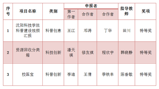 近日,2017沈阳大学生科普创意创新大赛圆满落幕。我校在本届大赛中共斩获94个奖项,分别是特等奖3项,一等奖19项,二等奖23项,三等奖30项,优秀奖19项。