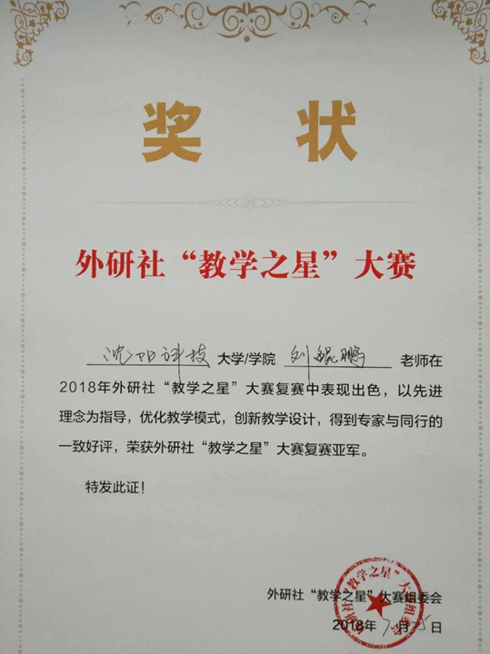 近日,外语教学与研究出版社2018年全国高校英语教学研究与教学发展系列研修班暨“教学之星”大赛复赛成绩揭晓,我校基础部外语教研室刘鲲鹏老师从40余所院校的47名参赛教师中脱颖而出,荣获亚军。