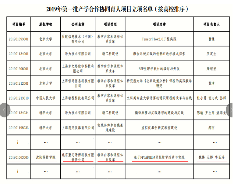 近日,教育部发布《教育部高等教育司关于公布有关企业支持的2019年第一批产学合作协同育人项目立项名单的函》。我校与北京至芯开源科技有限责任公司联合申报的《基于FPGA的EDA课程教学改革与实践》项目获批。