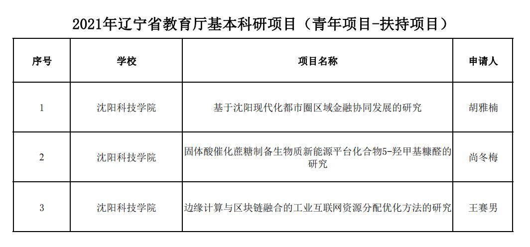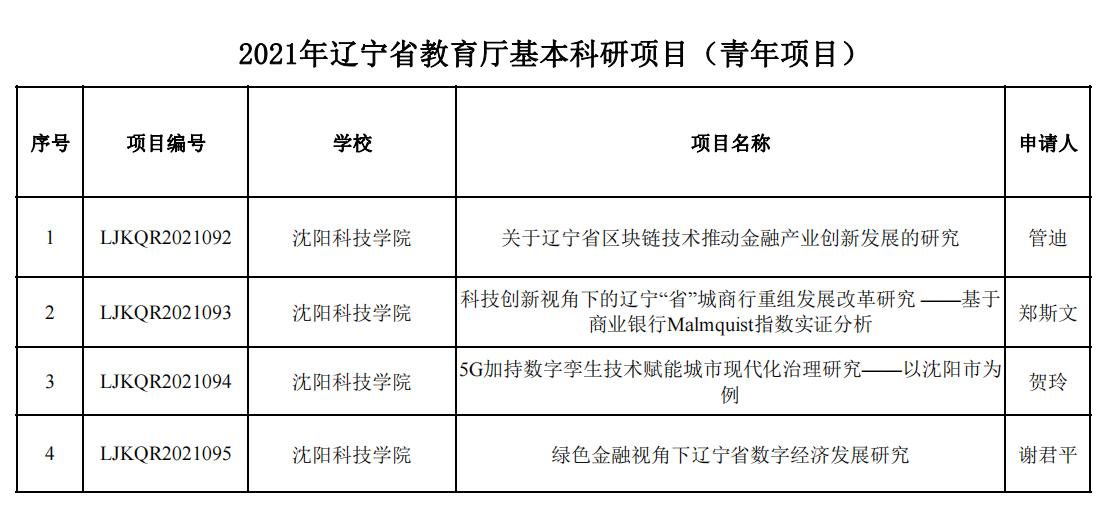 近日,辽宁省教育厅公布了《辽宁省教育厅办公室关于2021年度高等学校基本科研项目(青年项目)立项的通知》(辽教办[2021]453号)文件,经学校推荐、教育厅专家组遴选、厅长办公会审议通过,由我校教师管迪主持申报的《关于辽宁省区块链技术推动金融产业创新发展的研究》等4项课题获批为青年项目,由胡雅楠主持申报的《基于沈阳现代化都市圈区域金融协同发展的研究》等3项课题获批为青年扶持项目。