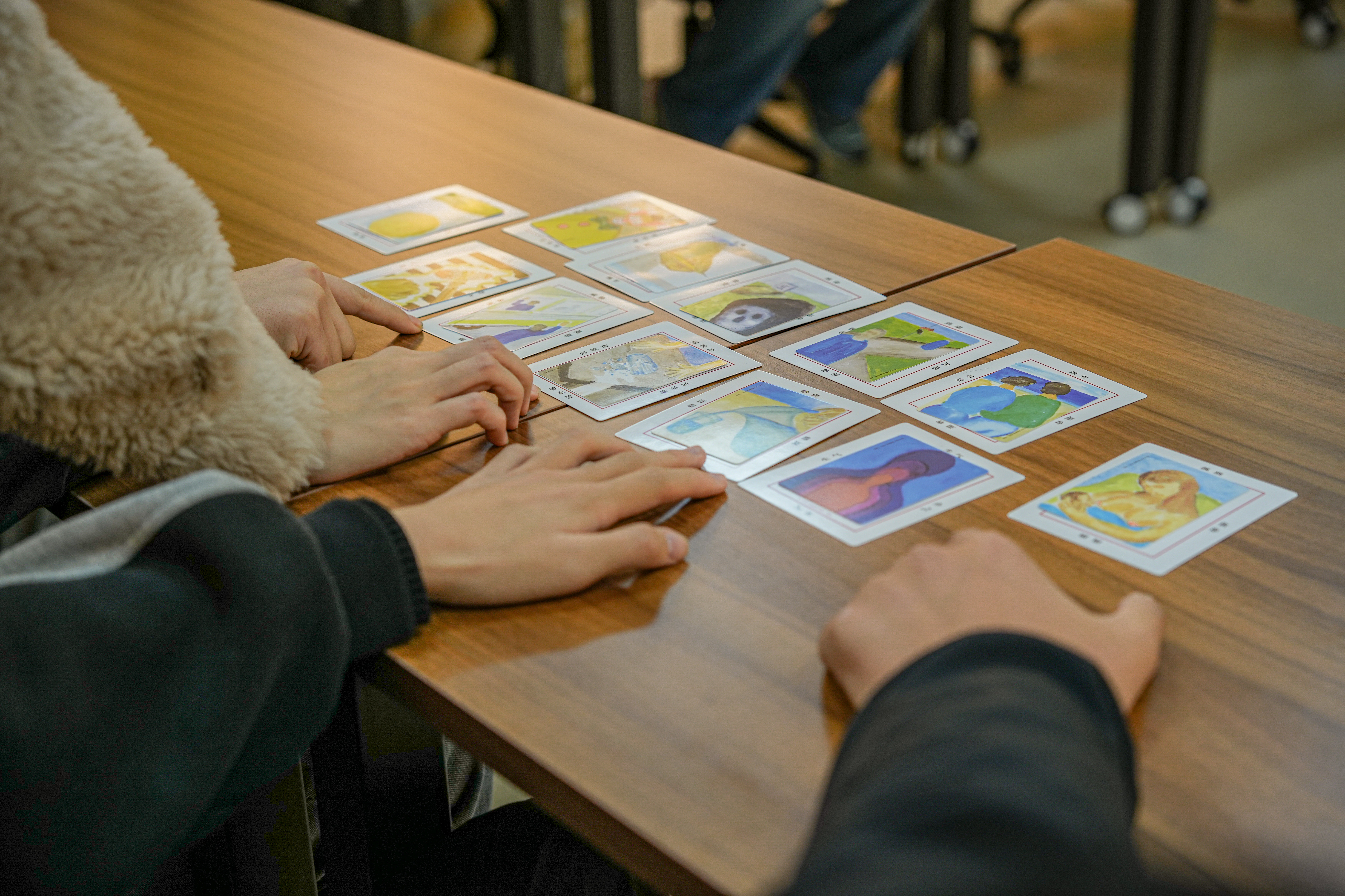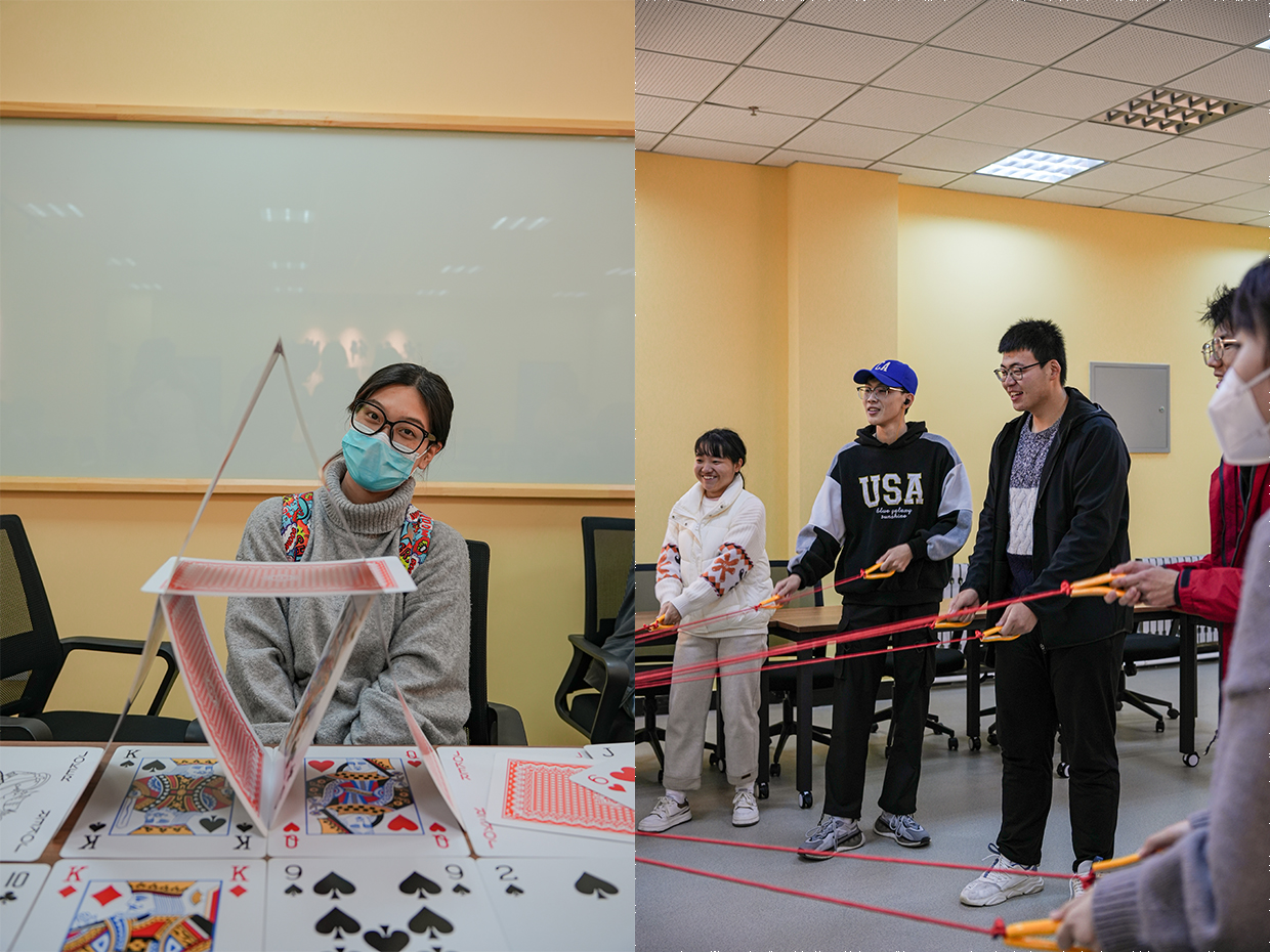 推开门,映入眼帘的是围成一圈的桌椅,大家围坐在这里进行一个又一个小游戏,增进感情。同心协力一起接球,或是分成小组进行其它各种有趣的游戏,例如:需要团队合作的哑人筑塔、竞技对抗类的光盘争夺等。