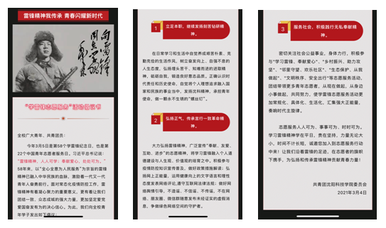 3月15日至3月26日,举办学雷锋网络文化节,通过以雷锋为主题的观影、歌唱、绘画、书法等形式向雷锋同志学习和致敬。