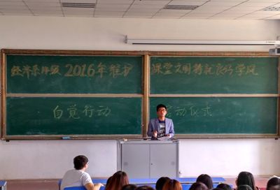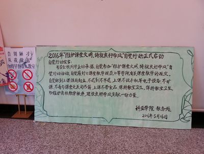 为保证课堂教学效果与教学质量,将2015年“自觉行动”的良好势头保持下去,学校于本周正式启动2016年“维护课堂文明,铸就良好学风”自觉行动活动。此项活动继续由教务处与学生处联合组织,各系部积极配合开展工作。2016年“自觉行动”活动全校135个班级,全部主动上交“自觉行动”申请表,并签署“自觉行动”承诺书。教务处借期中教学检查学生座谈会,在总结2015年“自觉行动”工作基础上,对2016年活动进行动员,特别强调“学习行为至尊奖”的内涵,让学生能够深刻理解“自觉行动”的意义,为启动2016年“自觉行动”开展宣传工作。
