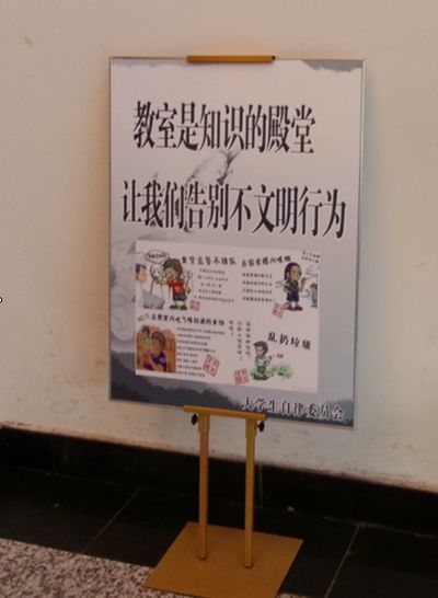 教学楼一楼大厅团委出板报宣传“自觉行动”