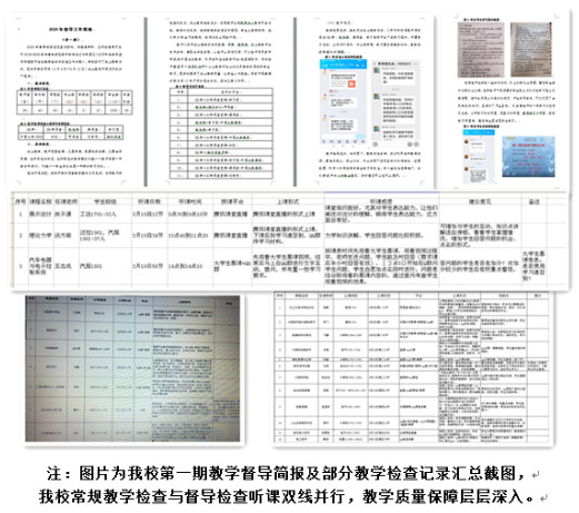 完善的方案是教学质量的前提保障,全校各教学职能部门、系部、教师、辅导员、学生各负其责,共同努力,开拓思维,创新方法,积累经验,创新教育教学成果,不断探索我校教学质量提升新途径。以在线教学为载体,教学大纲编写为契机,我校全体教师,结合教学实际,不断完善教学模式,带着探索、研究、改革、创新的任务,积极开展在线教学工作。目标明确、思路清晰,全体教师因地制宜,开拓创新,开发出10余种组合型教学方式,灵活多样,保证在线教学不断线,努力提高在线教学质量。日常教学检查与督导检查双线并行,学生辅导员助力在线教学,维护课堂秩序,在教学质量保障层层深入,确保在线教学质量不打折。