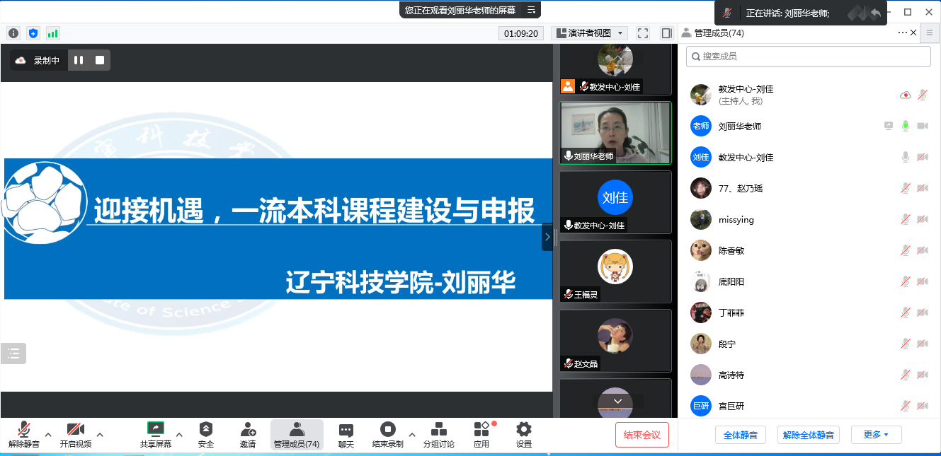 本次讲座是我校2022年度“教师能力提升”专项培训活动之一,旨在提升我校教师课程建设能力,助力省级一流本科课程申报推荐工作,特别邀请到辽宁科技学院电气与信息工程学院教授,国家一流课程、辽宁省精品共享课、精品课主持人刘丽华教授作题为“迎接机遇,一流本科课程建设与申报”的专题讲座。