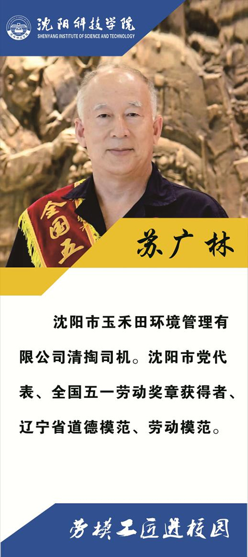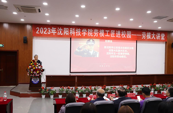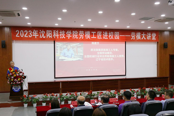 校党委书记耿乃国,纪委书记、副校长高洪震,学生处处长何大伟及各系学生工作副主任、部分辅导员教师出席本次活动;沈工中心融媒体工作部部长王欣欣,工作人员高小芳、游琳莅临现场;杨东文、苏广林、刘同霞、师俊威、杨建华、赵振金、赵越7位道德模范、劳动模范走进大讲堂与同学们见面,全国劳动模范杨建华、沈阳市劳动模范赵振金用自己的工作经历和先进事迹为沈科师生献上一堂生动的劳动教育课。