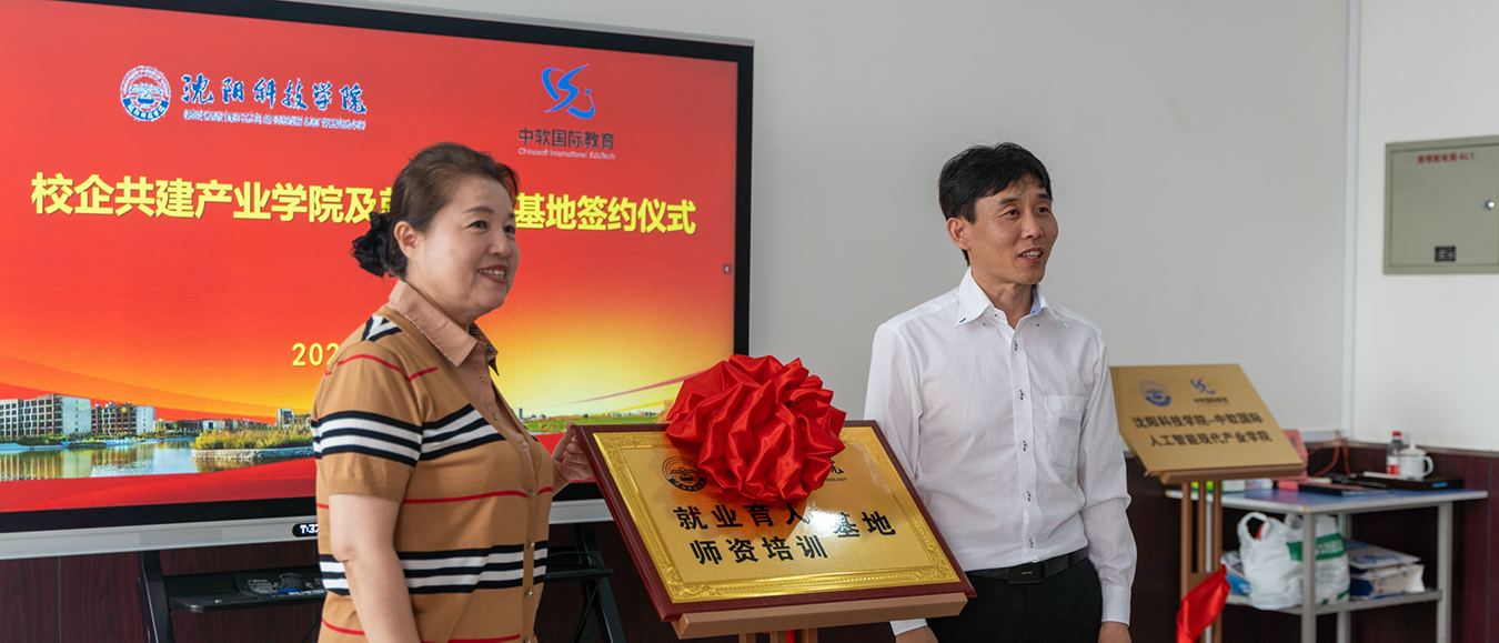 签约仪式上,在与会人员的见证下,学校副校长袁德成与中软国际教育集团(沈阳)交付总经理王丽代表校企双方签订了校企协同育人战略协议,达成双向合作意向。随后,孙玉红校长与孟祥玉总经理共同为“人工智能产业学院”及“就业育人及师资培训基地”揭牌,并合影留念。