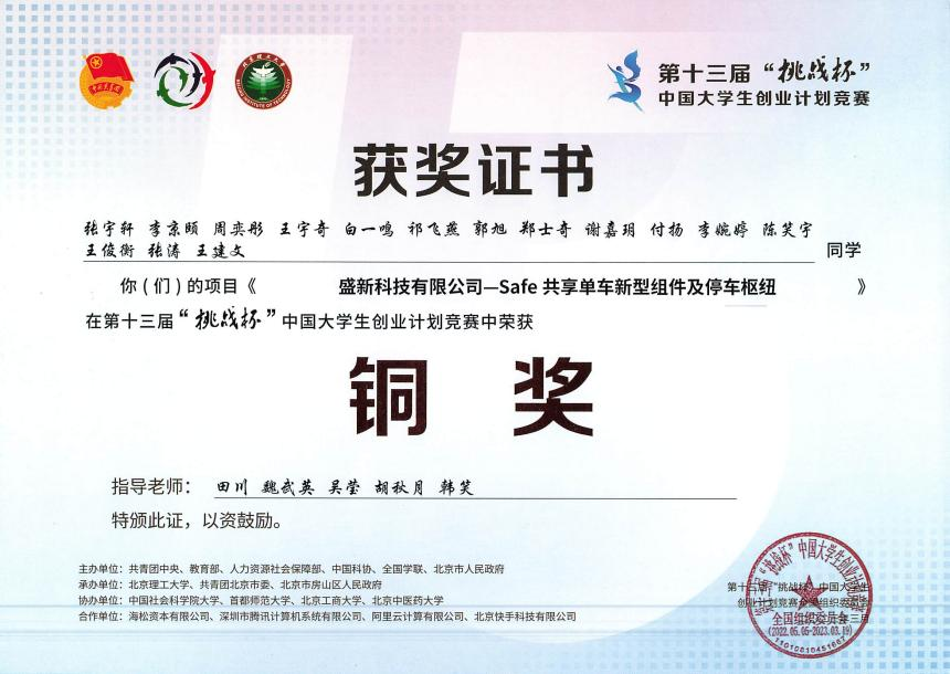 近日,由共青团中央、教育部、人力资源社会保障部、中国科协、全国学联和北京市人民政府共同主办的中国大学生创新创业“奥林匹克”盛会——第十三届“挑战杯”中国大学生创业计划竞赛全国决赛落下帷幕。我校晋级国赛的《盛新科技有限公司—Safe共享单车新型组件及停车枢纽》项目最终斩获国赛铜奖,创我校“挑战杯”中国大学生创业计划竞赛历史最好成绩。
