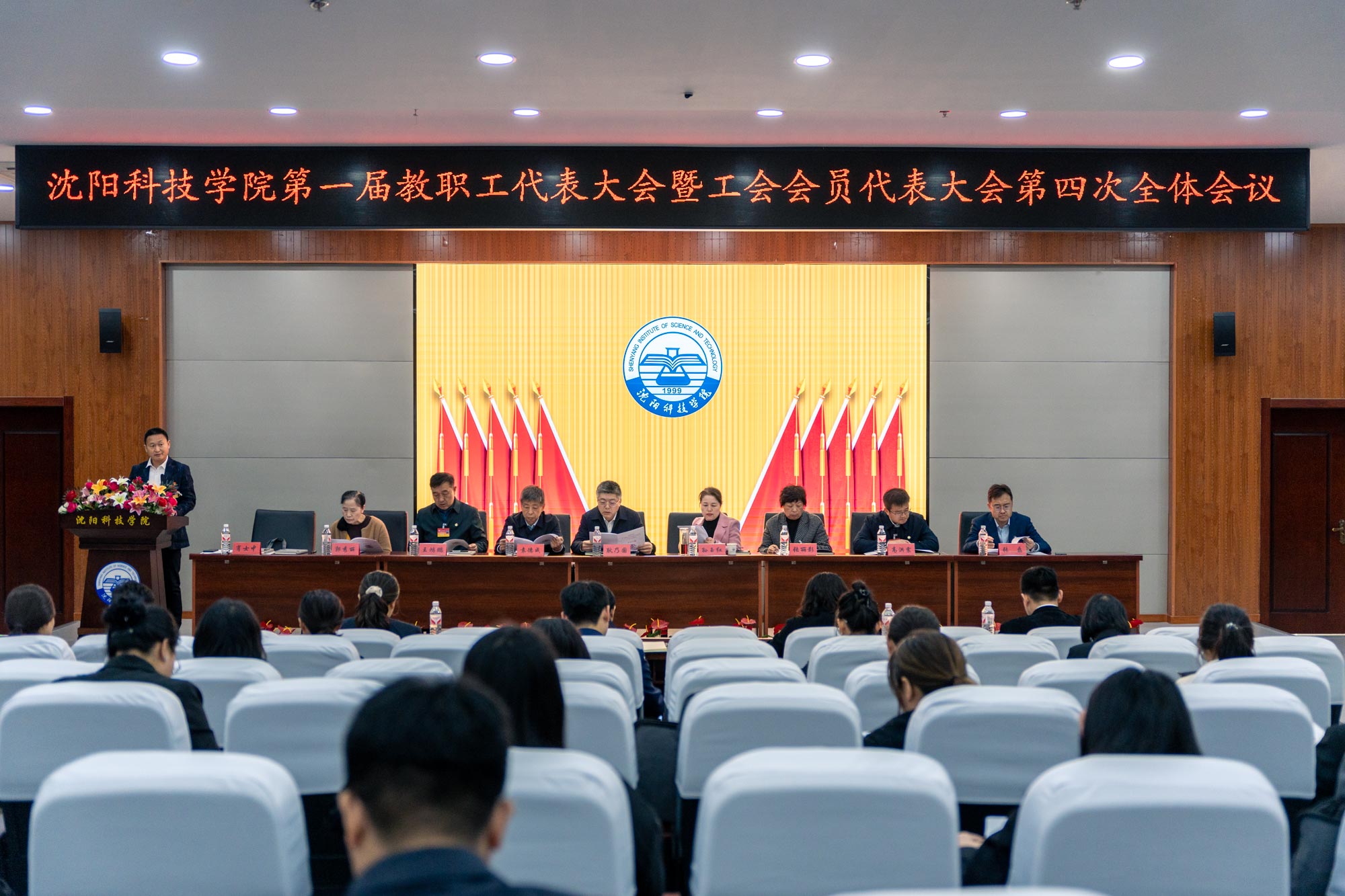 党委书记耿乃国发表了题为《携手同心共担发展使命 奋楫前行开创沈科辉煌真抓实干 全面推动学校高质量发展》的讲话。他首先代表学校党委对为学校建设发展付出辛勤努力的全体教职员工表示衷心感谢。就落实会议精神,推动学校高质量发展,提出三点意见:一要进一步凝聚共识,乘势而上把握新机遇。学校正举全校之力推进“迎评促建”各项工作,各单位要认真学习并贯彻落实好工作报告,抓住合格评估机遇,共同画出沈科的“最大同心圆”。二要进一步正视问题,蓄势赋能应对新挑战。要树立正确的发展理念,改善办学条件,提升教学质量和管理水平,提高干部、教师整体能力素质,结合评估工作、主题教育检视问题清单,认真总结学校存在的短板与差距,进一步强化制度建设,建立有效工作机制,促进学校高质量发展。三要进一步团结奋进,挺膺担当开创新局面。进一步激发干部职工的创造伟力,尊重、善待每一名教职员工,给干部职工提供更多的成长机会,以个人健康发展促进集体全面进步,弘扬实事求是、乐于奉献、干事担当的良好作风,充分发扬民主,营造人人争做主人翁的浓厚氛围。