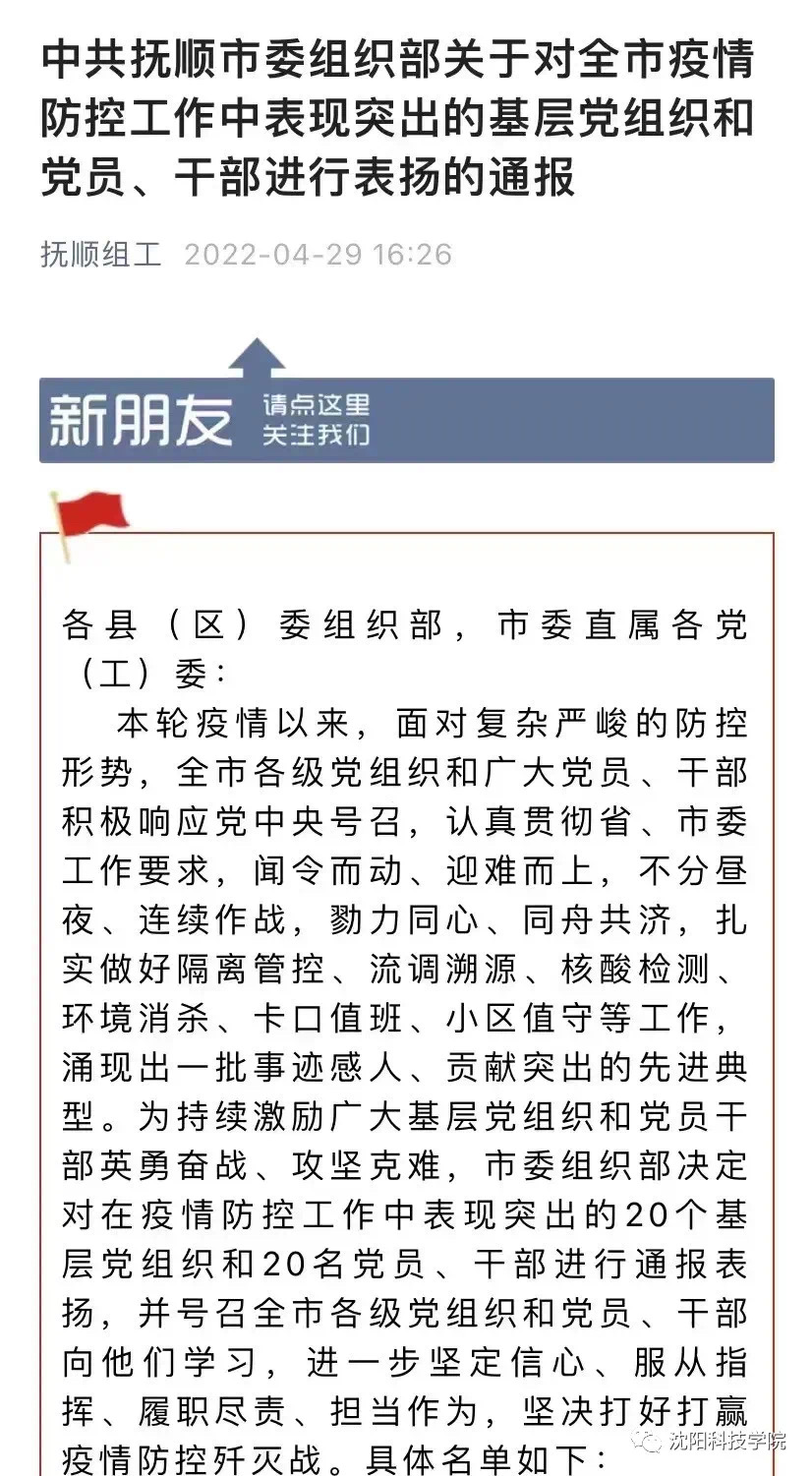 近日,中共抚顺市委组织部对全市疫情防控工作中表现突出的基层党组织和党员、干部进行了表扬。我校2020届毕业生戴鑫磊名列其中。