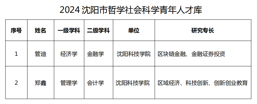 近日,沈阳市哲学社会科学规划办公室发布了《关于发布2024沈阳市哲学社会科学青年人才库的通知》,我校经济系教师管迪、管理与传媒系教师郑鑫成功入选。