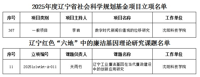 近日,从辽宁省社会科学规划基金办公室与辽宁省社会科学界联合会相继传来喜讯,我校人文学院教师李岩申报的《数字时代新闻价值观的位移研究》获批2025年度辽宁省社会科学规划基金项目;经济学院教师关雨竹申报的《辽宁工业廉洁基因在当代廉政建设中的创新应用研究》获批辽宁红色“六地”中的廉洁基因理论研究课题。此次两项课题的获批,标志着我校在省级人文社会科学研究领域取得了新进展,彰显了学校不断提升的科研实力与学术影响力。