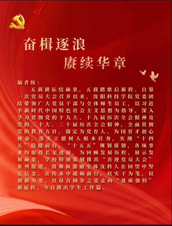 自第一党员大会以来,学校连续两年获评辽宁省征兵工作先进单位,获评辽宁省劳动教育示范院校,获评第三届辽宁省心理情景剧大赛三等奖,连续两年荣获辽宁省国防体育运动优秀组织单位,辅导员工作室——“云”说工作室获评辽宁省第二批辅导员工作室培育项目。学工队伍中涌现出一批先进典型,先后荣获“辽宁省辅导员年度人物”“全国优秀教育工作者”“沈阳市优秀辅导员”“沈阳市优秀学生工作干部”称号等多项荣誉。
