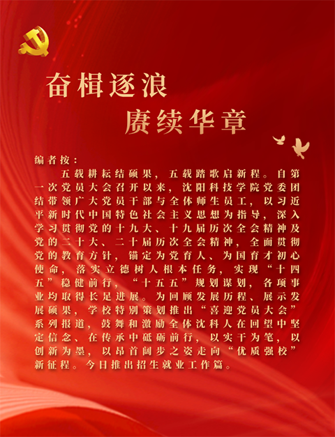 自第一次党员大会以来,学校坚持以习近平新时代中国特色社会主义思想为指导,紧扣立德树人根本任务,锚定学校高质量发展目标,招生“入口”与就业“出口”协同发力,高位推动招生就业各项工作,实现了生源质量逐步提升,毕业生就业去向落实率稳步提高的好成绩,为学校高质量发展和服务地方经济社会发展做出了积极贡献。