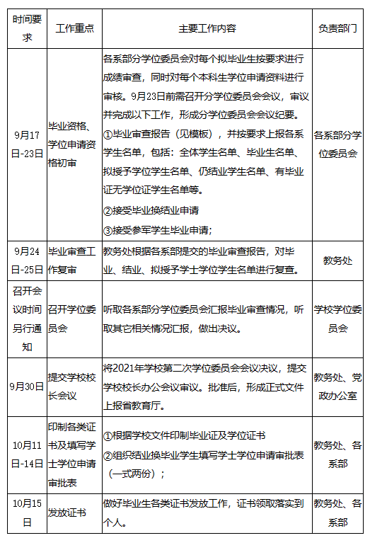 为认真贯彻落实国家教育部、省教育厅有关高等教育学历证书电子注册管理规定,进一步规范我校毕业资格审查、学历证书电子注册管理、学位管理,为做好2021届学生毕业资格和学士学位补授资格审查工作,请各系部高度重视,并认真按照日程安排表做好相关工作。