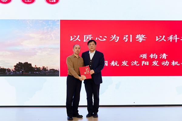 本次活动特邀2025年首批大国工匠人才、中国航发集团杰出工匠项钧清担任主讲嘉宾。宣讲中,项钧清以“匠心为引擎 科技报家国”为主题,结合自身在航空发动机试验领域数十年的深耕经历,生动讲述了从一名普通试验员成长为大国工匠的奋斗历程。他分享了在中国航发沈阳发动机研究所的工作日常,从动力系统运维、试验器设计到技术创新突破,用“好奇心+兴趣是创新原始动力”“专业能力是创新前提”“逆向思维打破固定模式”等实践感悟,让在场师生深刻理解“执着专注、精益求精、一丝不苟、追求卓越”的工匠精神内涵。同时,项钧清还结合国家对工匠人才的重视政策与航空发动机领域的技术突破,阐释了大国工匠对推动中国制造向中国创造转变的重要意义,鼓励青年学子珍惜校园时光,既要夯实理论基础,更要锤炼实践技能,在平凡岗位上铸就非凡价值。